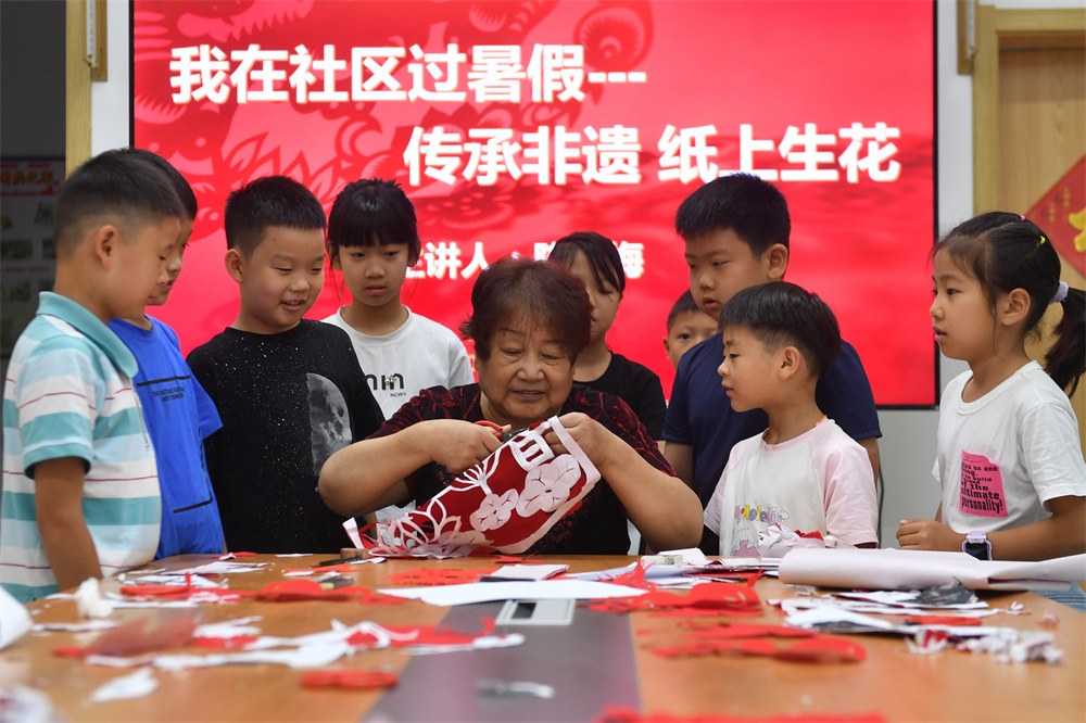7月22日,非遗剪纸传承人为孩子们传授剪纸技艺。