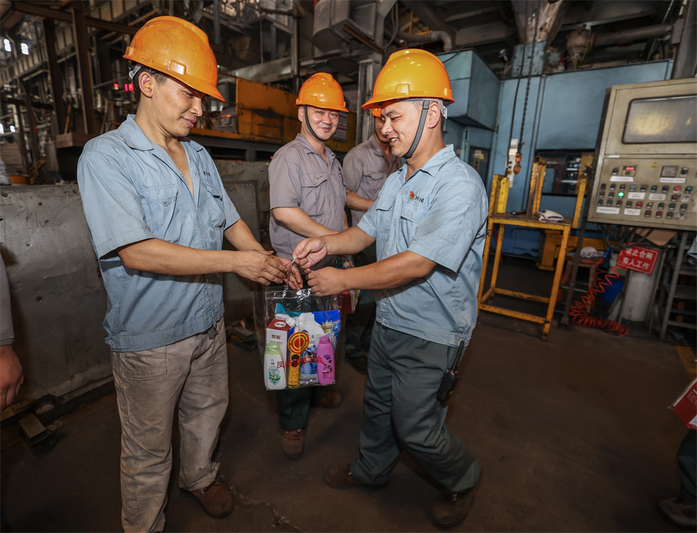 7月23日,在位于浙江嘉兴市南湖区凤桥镇的宏丰机械有限公司铸造车间内,企业工会负责人给工人发放夏季清凉用品。 新华社记者 徐 昱 摄