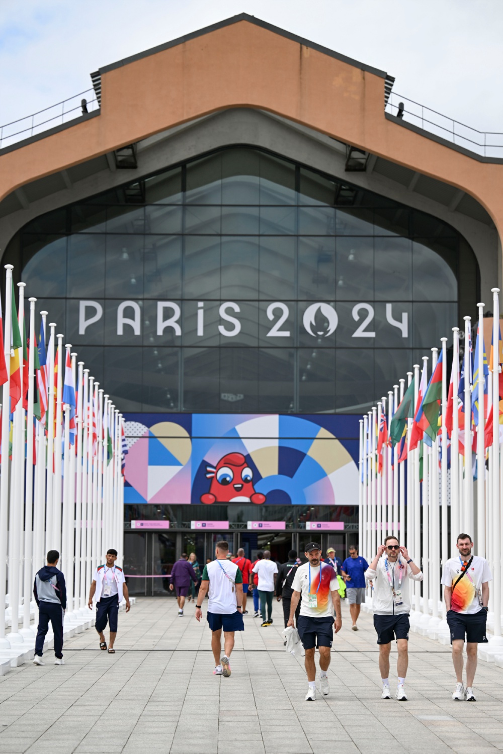 7月23日,来自不同代表团的运动员及工作人员进出巴黎奥运村餐厅。