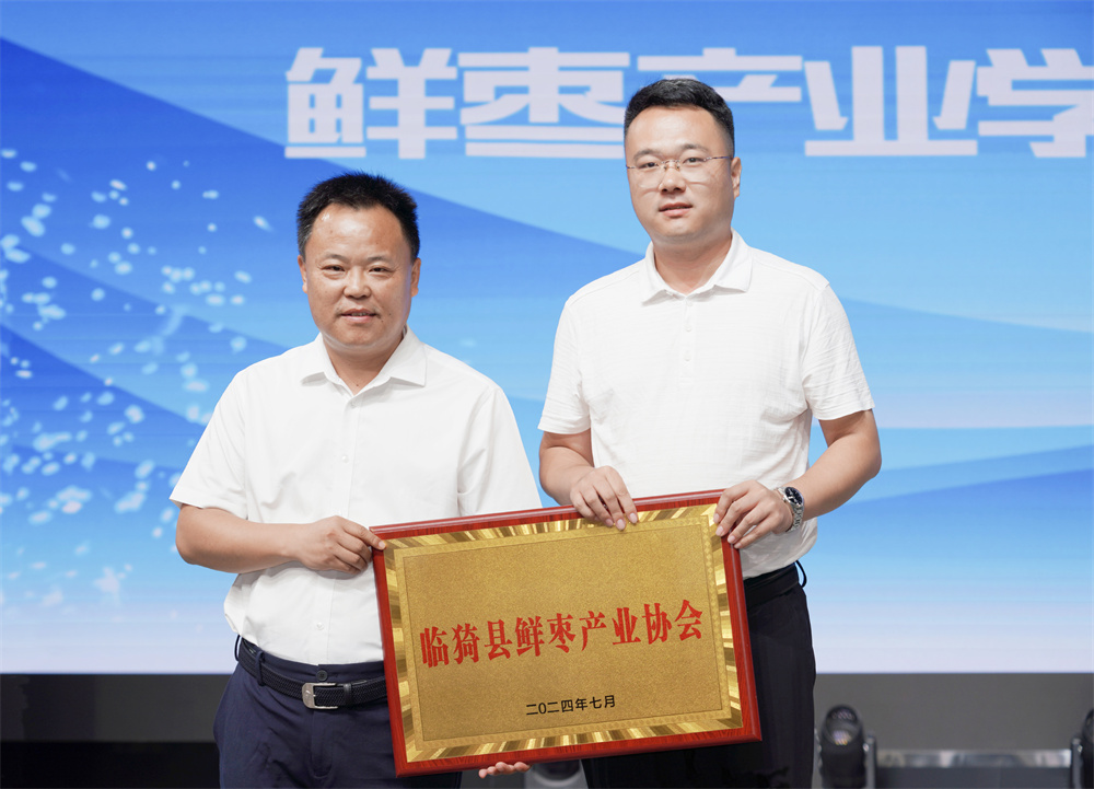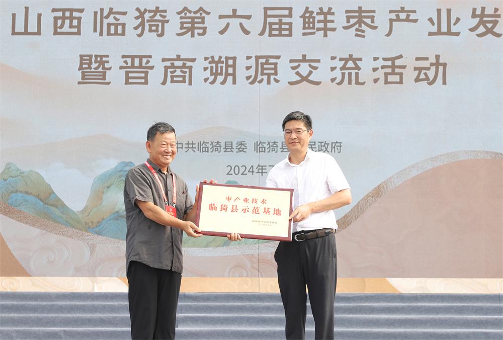 开幕式上,北京市农林科学院林业果树研究所首席专家姜全向临猗县颁授“枣产业技术临猗县示范基地”牌匾。该荣誉的颁授,不仅是对临猗县深耕鲜枣领域、赋能产业发展的充分认可与肯定,更是对未来推动临猗鲜枣产业技术创新、品质提升及市场影响力持续扩大的美好期许与鼓励。