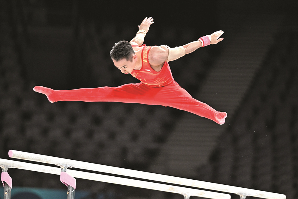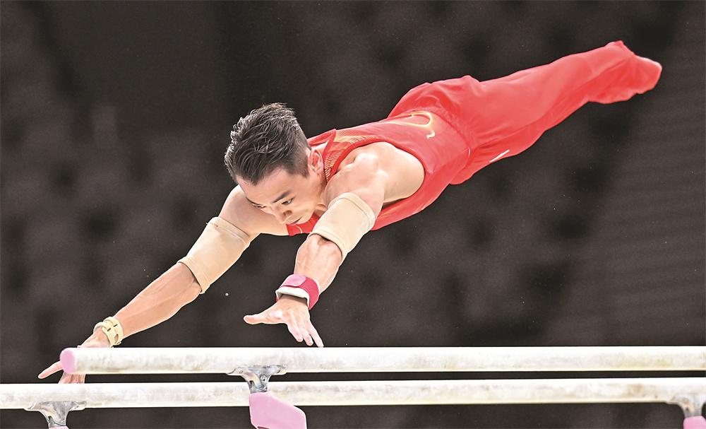 7月24日,中国队选手邹敬园在进行双杠项目训练。
