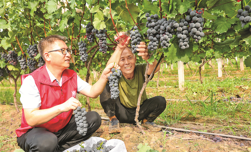 7月26日,夏县水头镇党员志愿者帮助果农采收葡萄。盛夏时节,水头镇万亩葡萄陆续进入收获期,该镇党委及时组织党员志愿者走进田间地头,帮助果农采收葡萄。 特约摄影 张秀峰 摄