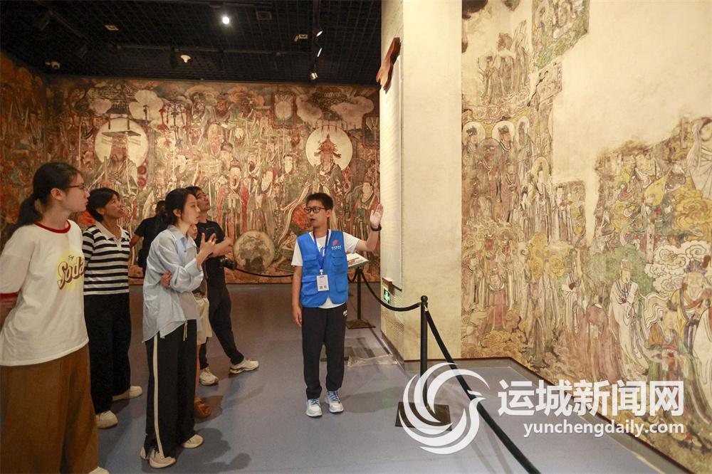 7月27日,运城博物馆内,学生讲解员为参观者讲解。