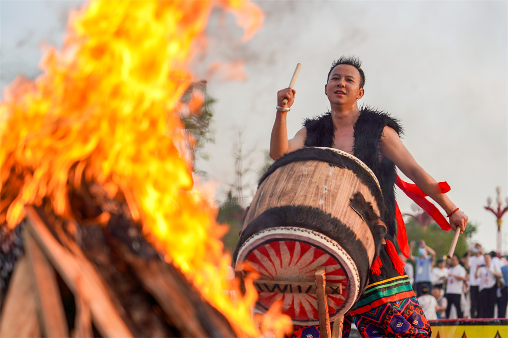 7月27日,在祭火大典上,演员敲鼓欢迎游客到来。