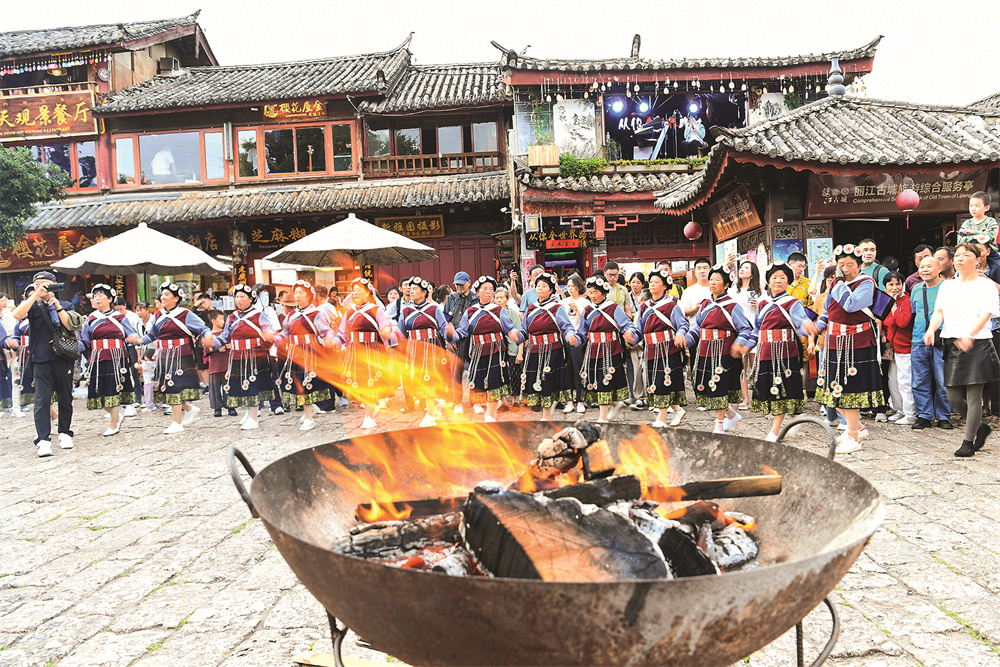 7月27日,游客和居民在云南丽江古城打跳游玩。