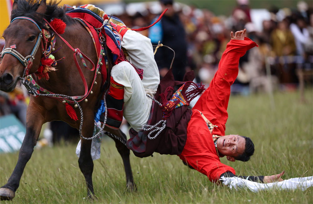 7月28日,当地群众在参加骑马拾哈达比赛。