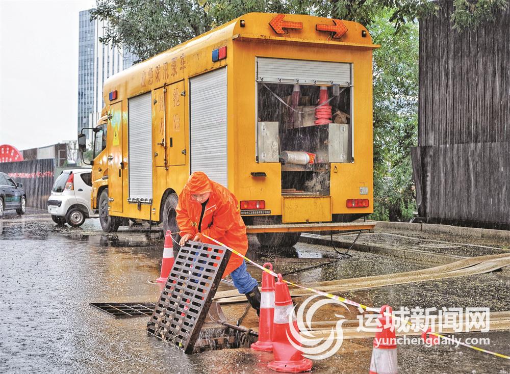7月29日,市城市管理局排水服务中心工作人员在中心城区学苑路与大禹街交叉口查看下水管道排水情况。 本报记者 陈方斌 摄