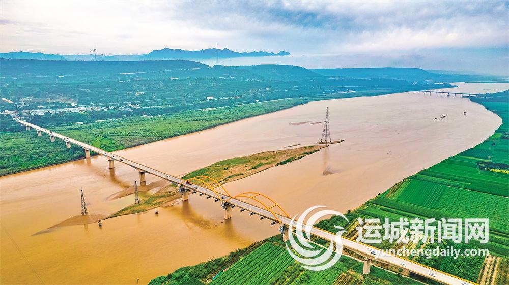 近年来,芮城县大力推行河长制,切实保护黄河水生态,着力打造生态廊道,绘就新时代黄河流域生态保护和高质量发展新画卷。图为芮城县风陵渡黄河大桥两岸航拍画面(7月29日摄)。