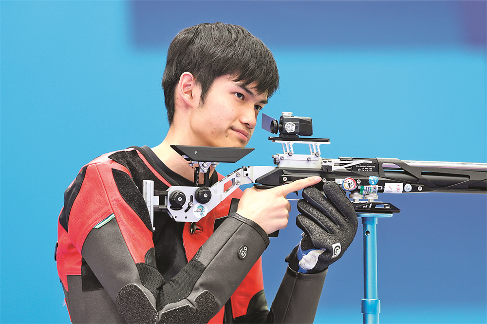 7月29日,盛李豪在比赛中。 当日,在法国沙托鲁举行的巴黎奥运会射击男子10米气步枪决赛中,中国选手盛李豪获得冠军。 新华社记者 赵丁喆 摄