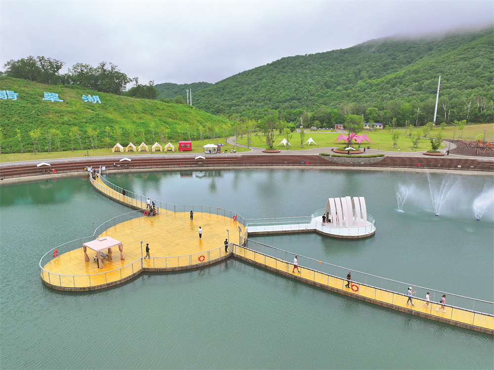 7月27日,游客在黑龙江宝清县翡翠湖矿坑公园游览(无人机照片)。