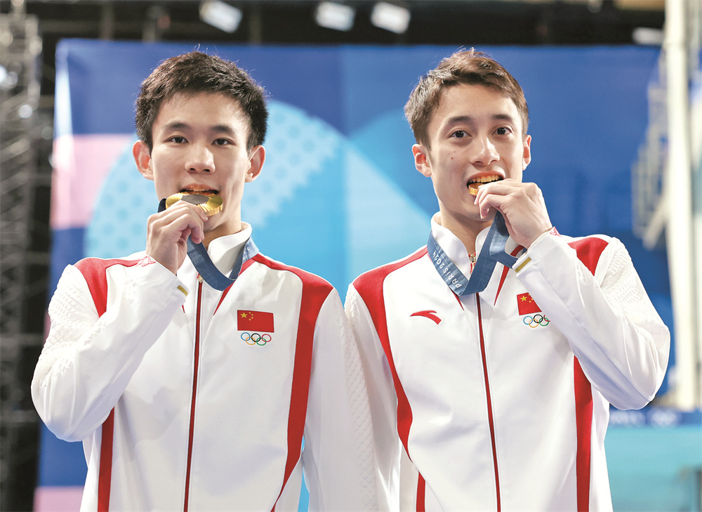 当日,在巴黎奥运会跳水男子双人十米台决赛中,中国选手练俊杰/杨昊夺得金牌。 新华社记者 李 颖 摄