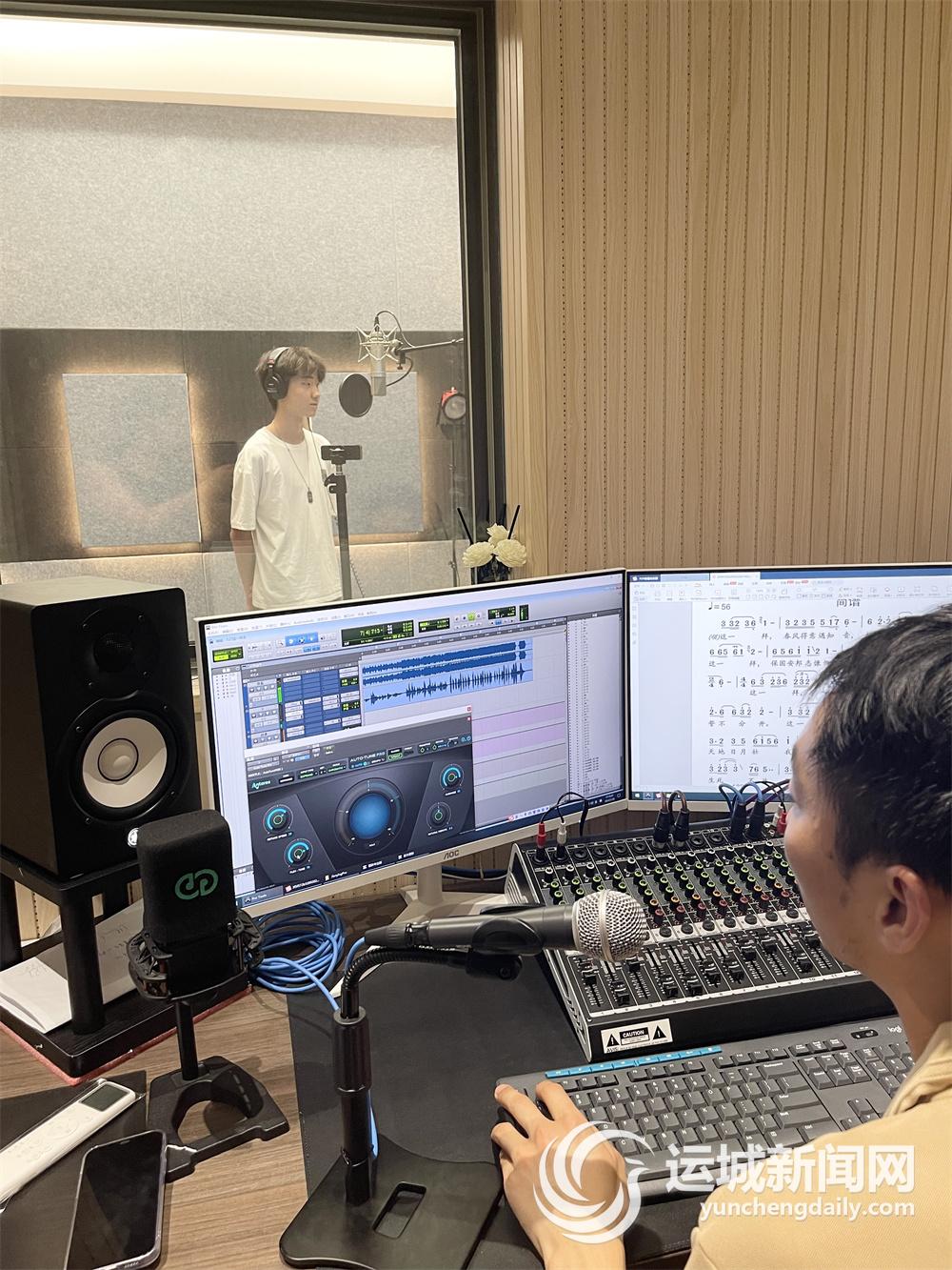 记者来到工作室时,正好碰上周周在帮人录歌。