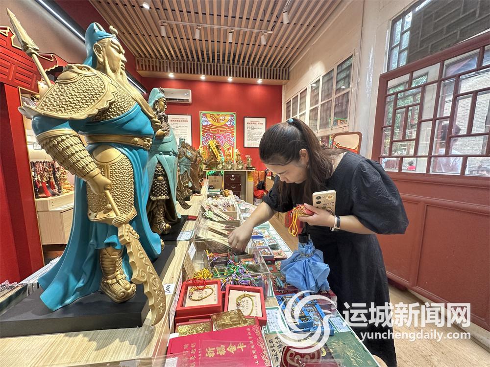 同样的,在常平关帝家庙东西廊房展销的关公文创、关公品牌产品,也以另一种载体宣传了关公文化。据工作人员介绍,关公文创和品牌产品有400余种,冰箱贴、创意本、书签、手提包等琳琅满目的文创产品丰富了大众的选择。来自太原的李先生购买了胸针和挂坠,他表示,这既是一种收藏,也能提醒自己时刻牢记关公的精神品德。