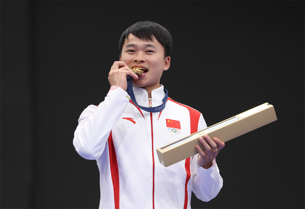 当日,在法国沙托鲁举行的巴黎奥运会射击男子10米气手枪决赛中,中国选手谢瑜夺冠。 新华社记者 赵丁喆 摄