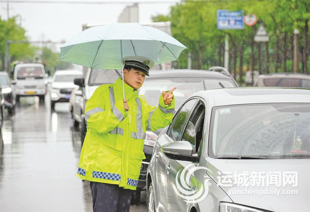 交警冒雨在中心城区红旗东街附近疏导交通。记者 闫 鑫 摄