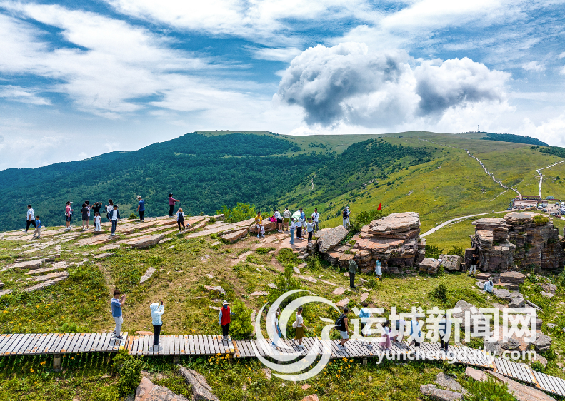 7月28日,游人在垣曲县历山风景区舜王坪赏景游玩。