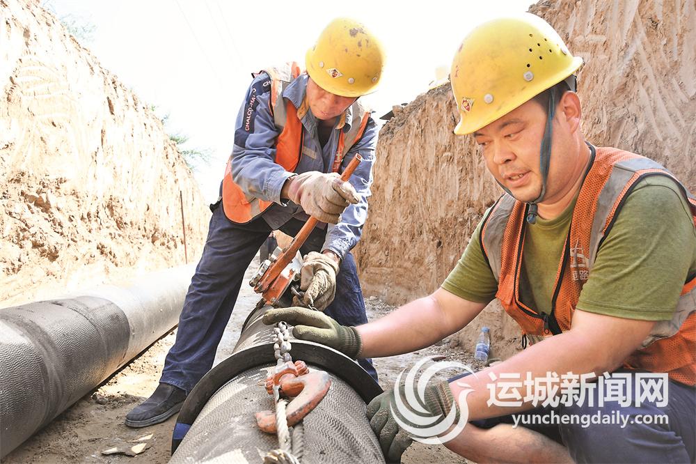 7月26日,河津经济技术开发区化工园区基础设施建设项目供水管道施工现场,施工人员在进行管道安装。