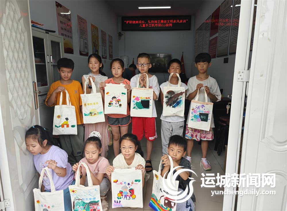 7月22日,盐湖区安邑街道禹都社区开办了暑期公益托管班——“护助健康成长 弘扬清正廉洁文明家风家训·儿童手工帆布袋DIY涂鸦”,通过寓教于乐、绘画创作的方式,引导辖区青少年从小树立清正廉洁、环保文明的意识,护助他们健康成长。