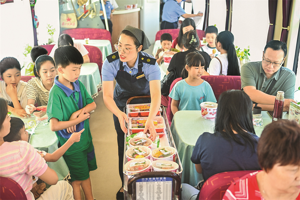 暑假期间,中国铁路上海局集团公司杭州客运段针对儿童旅客客流增加的情况,更新了列车餐车菜单,推出了一系列适合儿童旅客食用的儿童套餐,丰富儿童旅客的暑期旅途生活。新华社记者 江 汉 摄