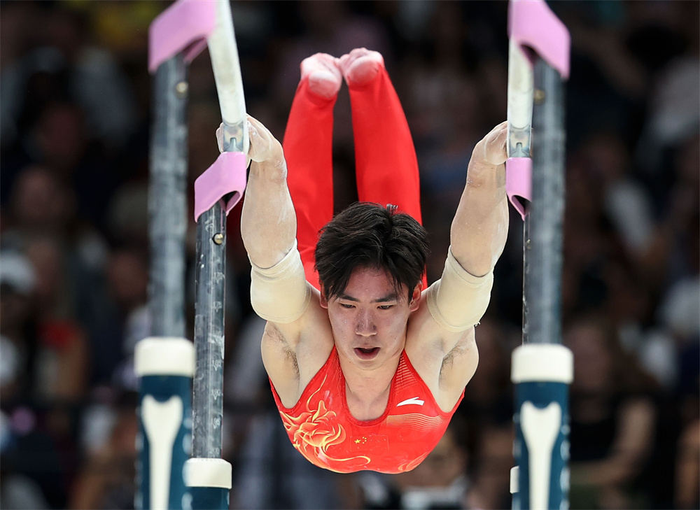 7月31日,中国选手张博恒在单杠、双杠比赛中。