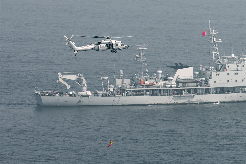 北部战区空军某部与海军某部组织海上联合搜救训练,救生员即将入水(7月30日摄)。