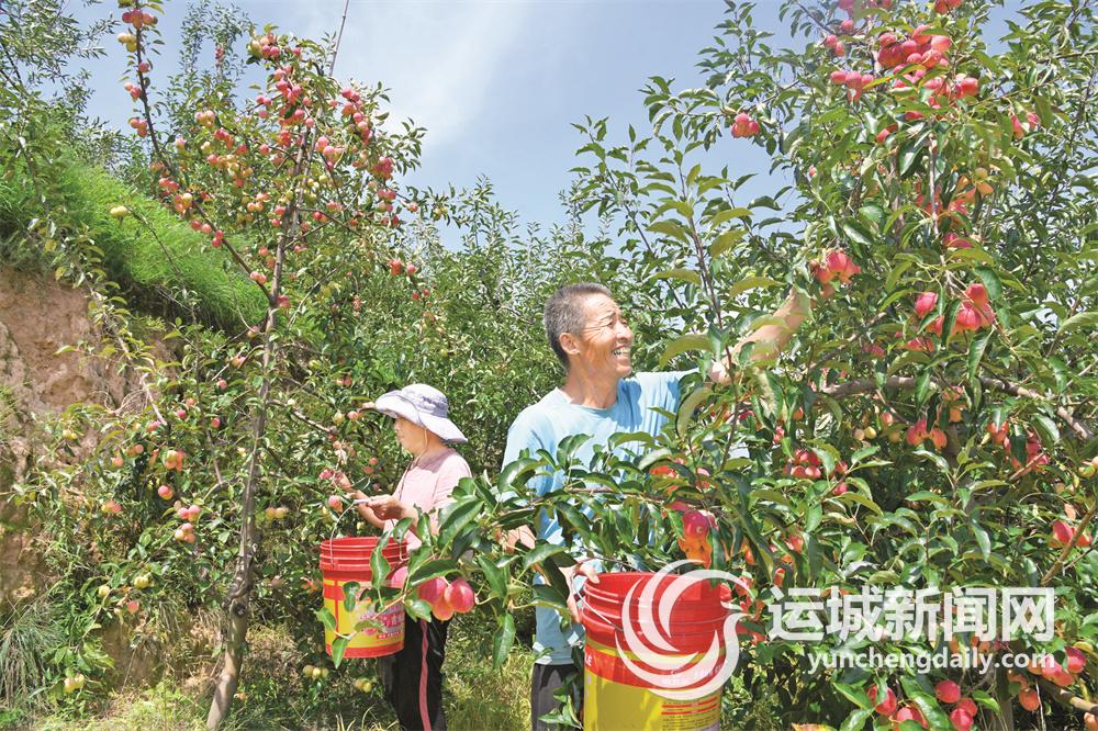 一路爬坡来到坡申村,道路两侧皆是红彤彤的各种水果,一个个娇艳欲滴,在绿叶的映衬下显得格外醒目,有苹果、油桃等,光是苹果就有鸡心果、维纳斯黄金、新世纪3个品种。放眼望去,村民正在采摘已经成熟的珍珠枣油桃,尽情享受着丰收带来的喜悦。