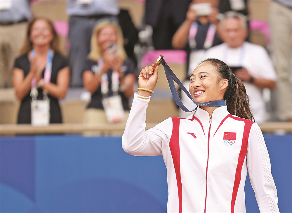 8月3日,郑钦文在颁奖仪式上展示金牌。 当日,在巴黎奥运会网球女子单打金牌赛中,中国选手郑钦文2比0战胜克罗地亚选手维基奇,夺得金牌。 新华社记者 万 象 摄