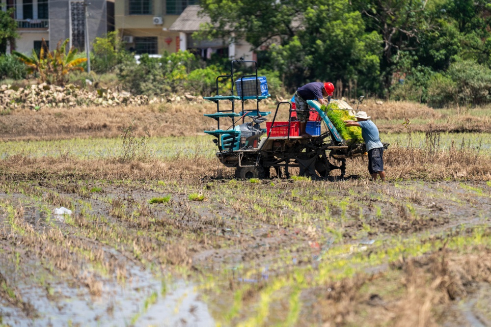 8月5日,在湖南湘潭县河口镇莲托村,村民整理晚稻秧苗。