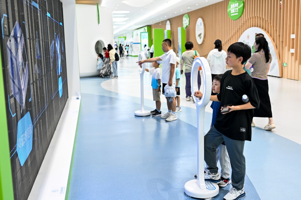 7月25日,小观众在呼和浩特市伊利健康谷景区体验互动设施。