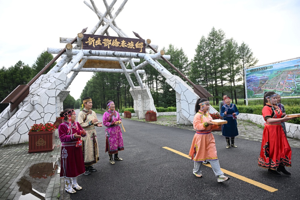 7月20日,在黑龙江省黑河市,新生鄂伦春族乡村民在村口迎接游客。