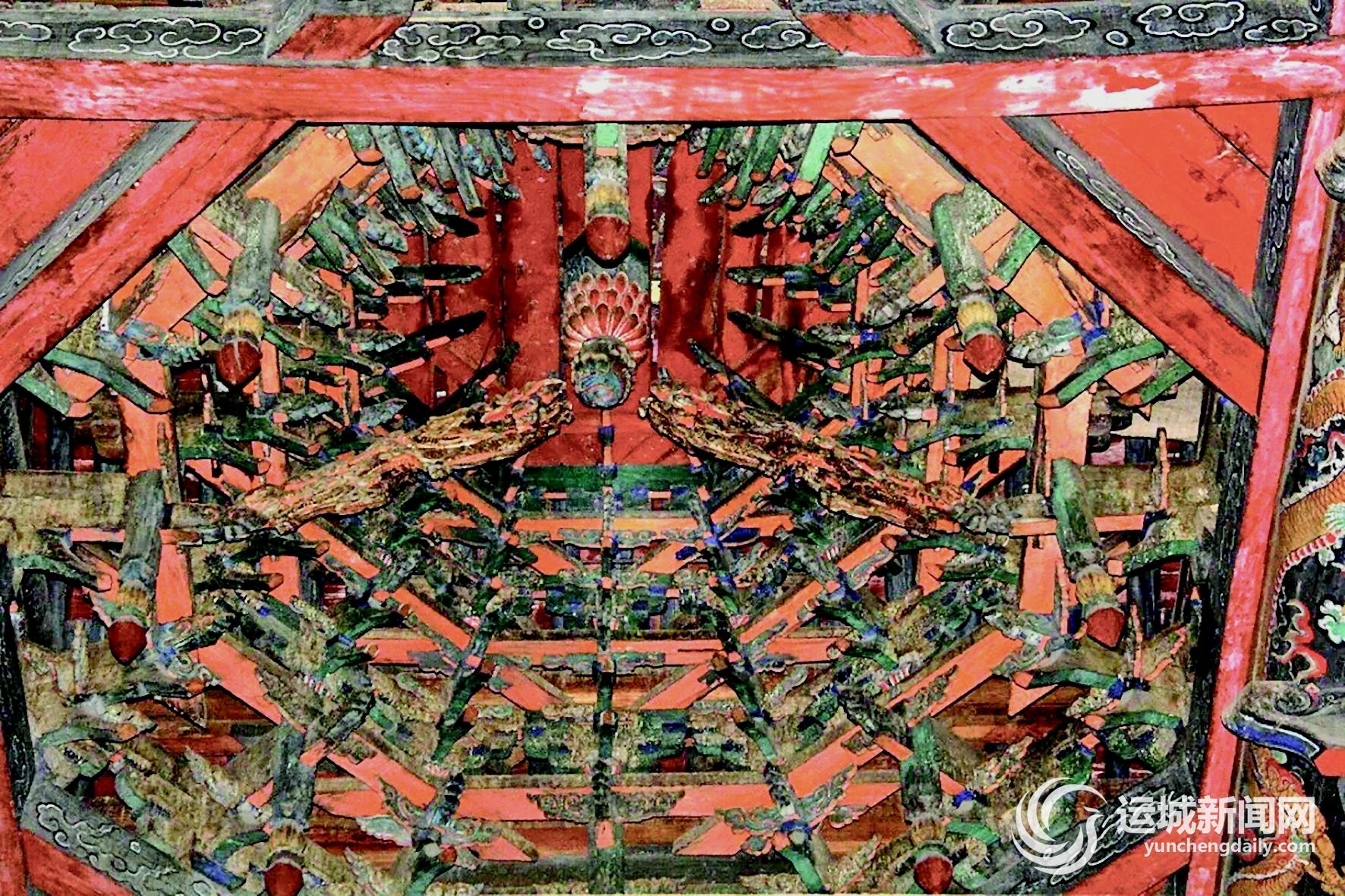 两次间藻井的格局对称,形制结构近同,平面八角形,造型华丽,悬以当空,犹如怒放的菊花,由中心向四周放射,中心突出,花瓣重叠,周围无所凭依,构造奇异而精巧。这在我国现存古建筑中还是唯一的实例。