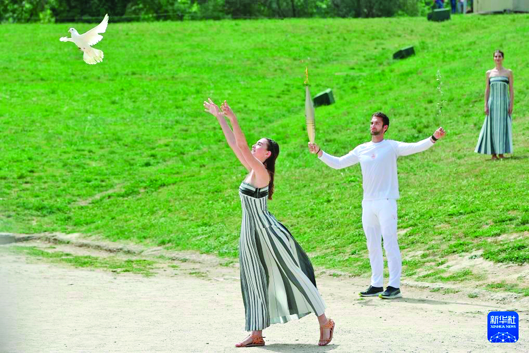 在希腊古奥林匹亚遗址,扮演女祭司的演员放飞鸽子。 新华社记者 赵丁喆 作