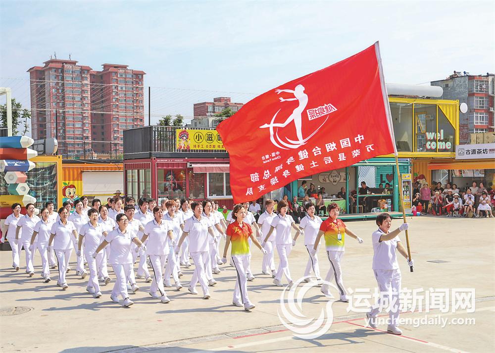 8月6日,由万荣县教育体育局、解店镇党委主办的“奋进新征程 运动促健康”第16个全民健身日展演活动举行。图为健身表演队在表演。