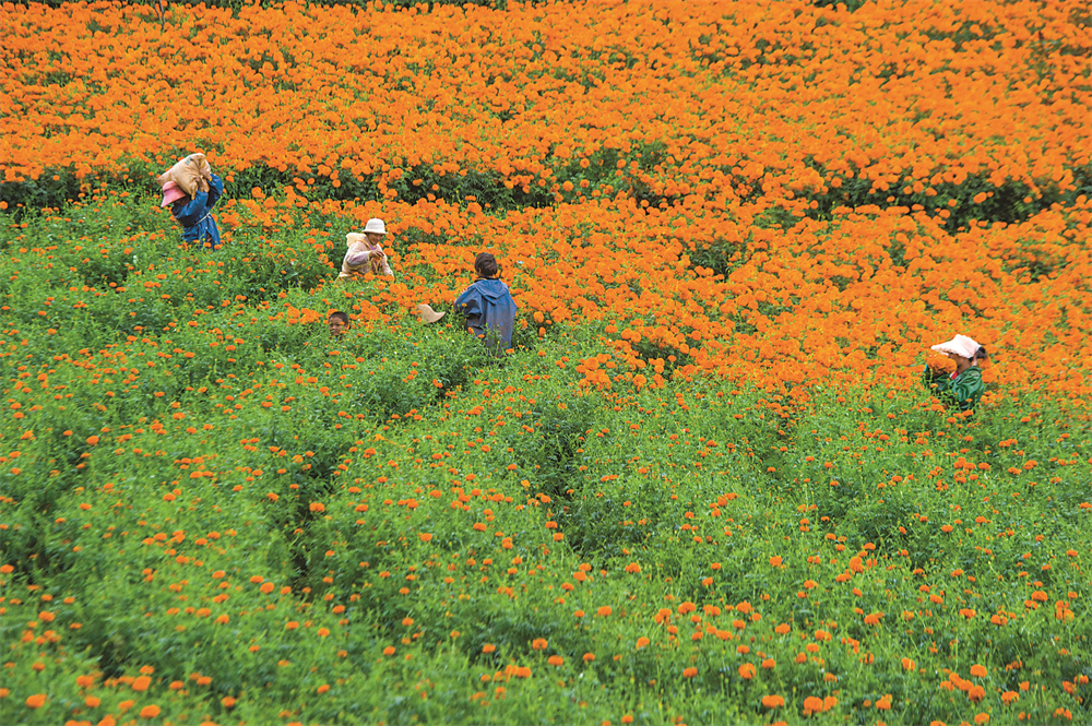 8月7日,云南省文山壮族苗族自治州丘北县腻脚彝族乡架木革村村民采收万寿菊。新华社发(熊平祥 摄)