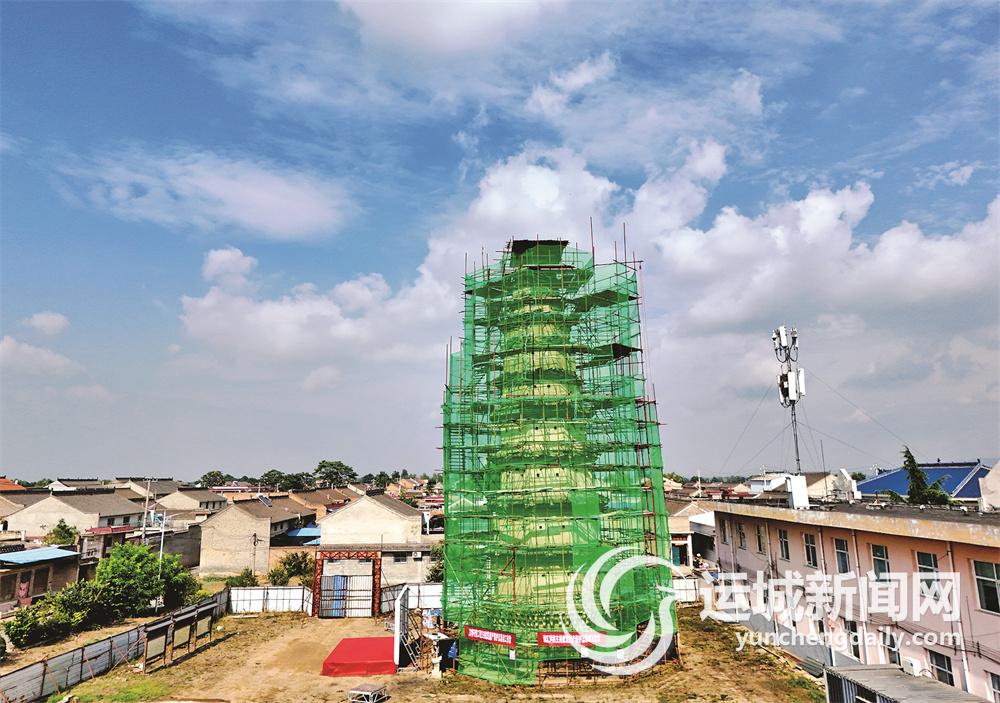8月6日,万荣县里望乡南阳寿圣寺塔修缮现场,工人们冒着酷暑正在紧张抢修。