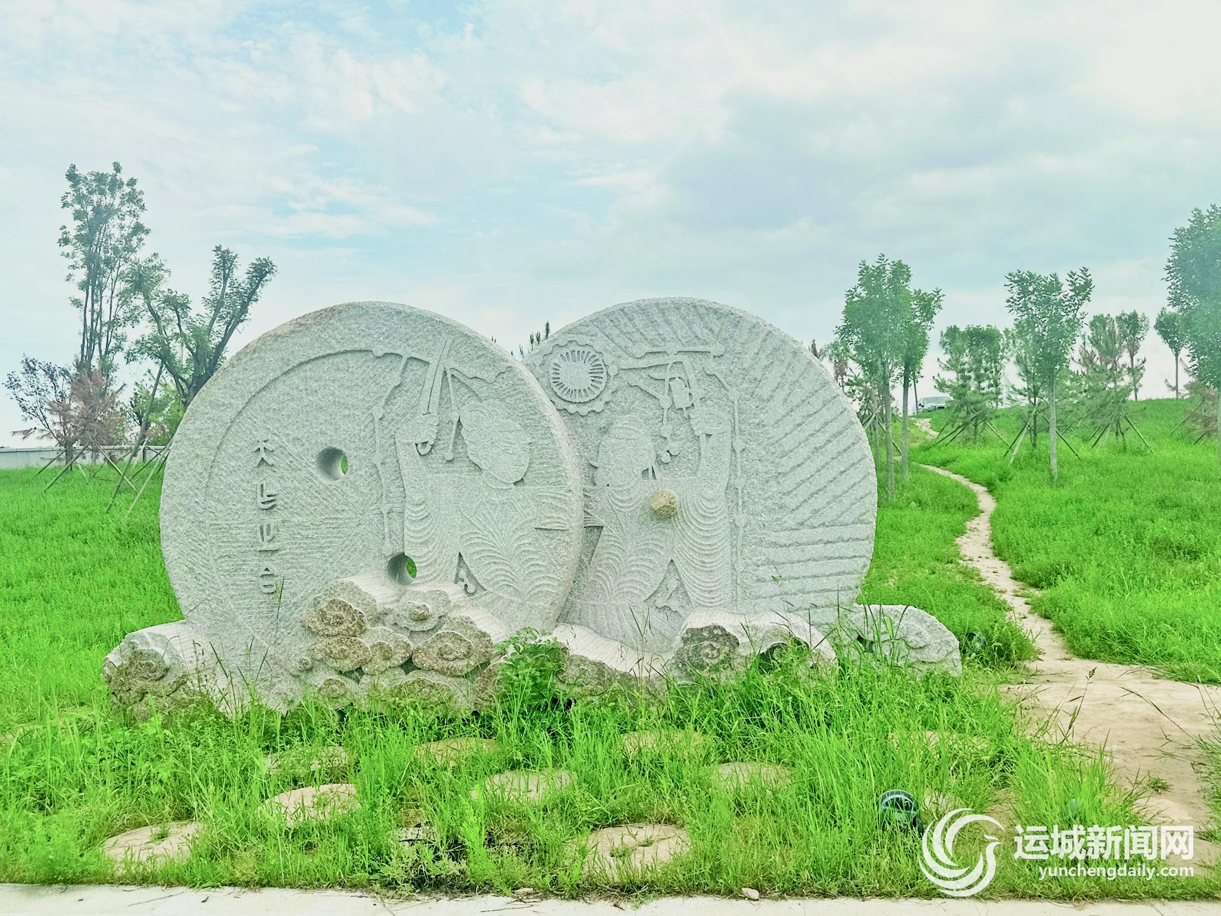 在河东成语典故园中,“天作之合”塑像便是紧紧相靠的两块巨大磨盘,上面绘有伏羲女娲图。日月星辰环绕中,伏羲手持距尺,女娲手持圆规,不仅体现“无规矩不成方圆”的道理,也代表了当时古代人们的宇宙观。原来与自然的相处,与生命的起源,人类早给出了答案。