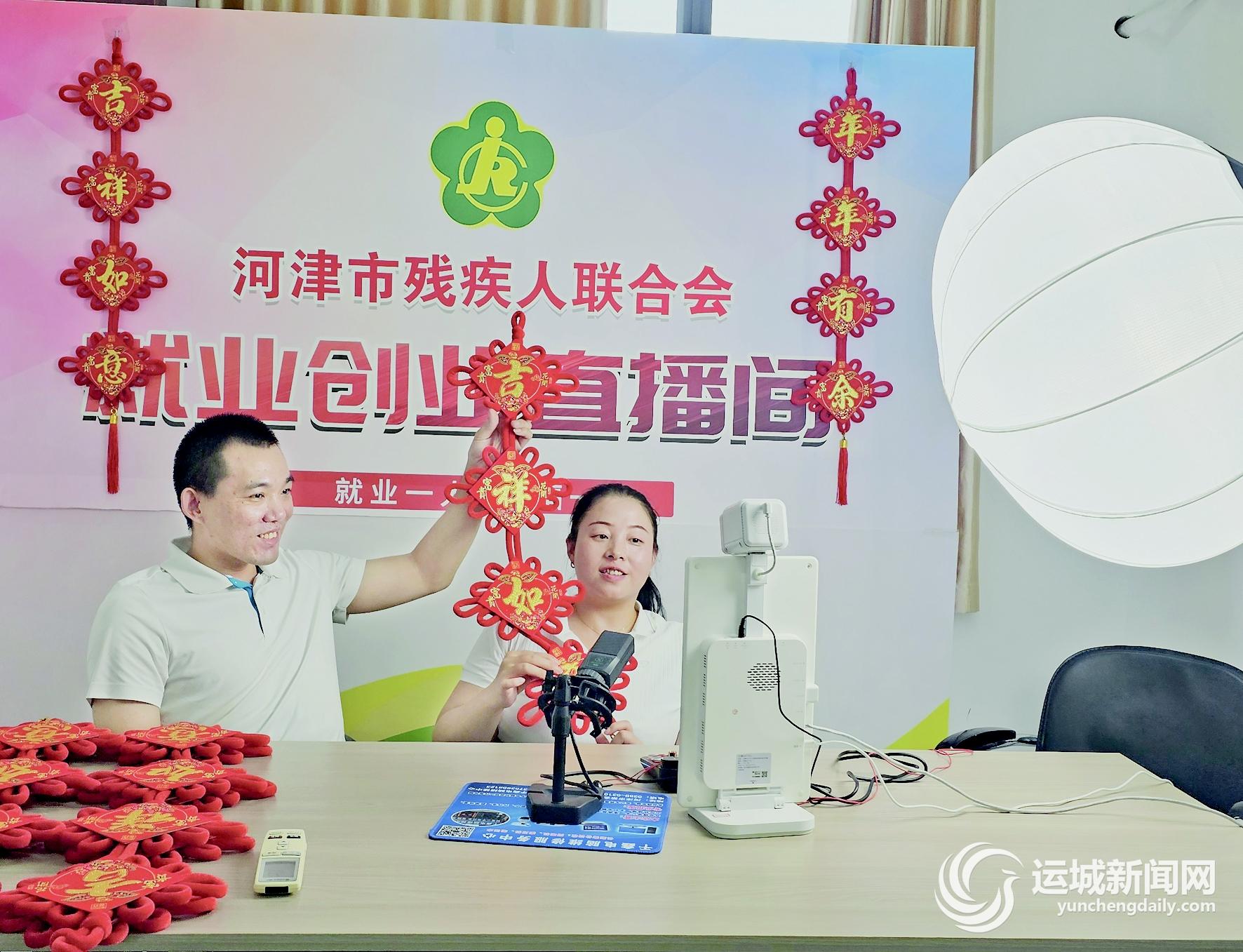 “家人们,咱们这个对联中国结挂在客厅特别漂亮,很喜庆!”见到昝美好时,她正和爱人在河津市残疾人就业创业孵化基地的就业创业直播间练习直播话术。