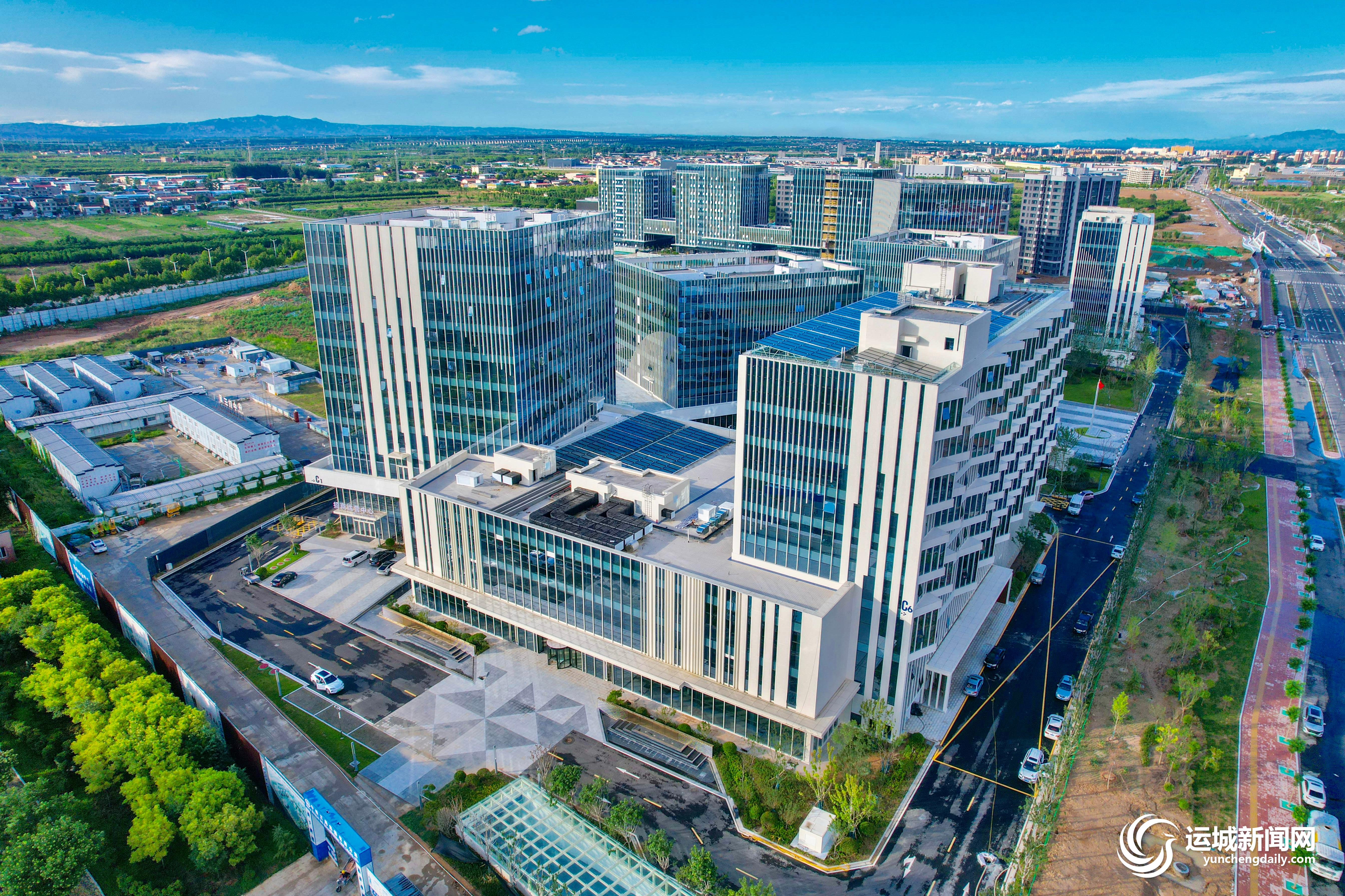目前,黄河金三角(运城)创新生态集聚区科创城项目初见雏形,主体工程已经完成,正在进行内部装修等工作(8月8日摄)。