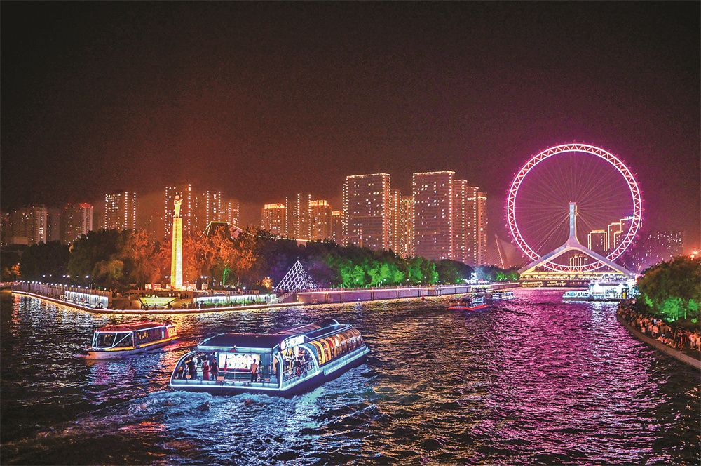 暑假夜晚的天津中心城区海河两岸流光溢彩,热闹非凡。人们来到海河畔听户外音乐会,散步纳凉,在休闲中品味美好生活。 新华社记者 孙凡越 摄