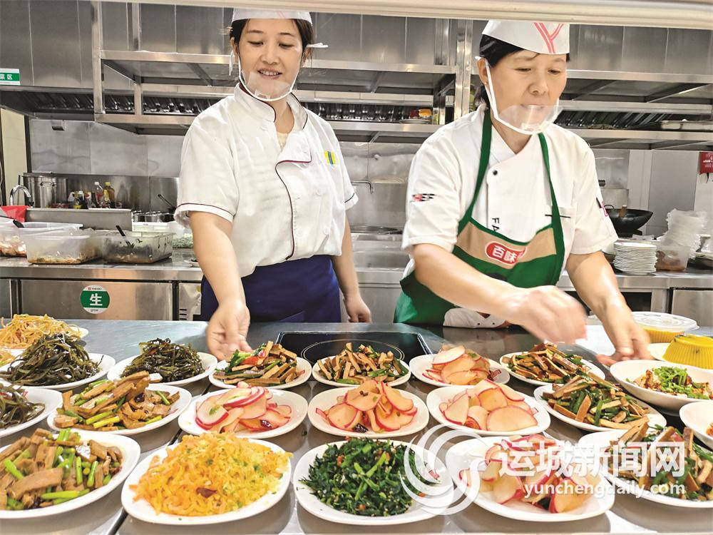 餐厅一侧为堂食区,一侧为“档口”区。在凉菜区,有凉拌海带丝、一面情深、韭菜拌豆干、胡萝卜蒜菜等小碗菜整齐排列;热菜区有鸡米花、鱼香肉丝、烧腐竹、清炒豆芽等8种菜品;小吃区有小蛋糕、豌豆糕等;主食区有面食、饺子、米饭、米线、羊肉泡等。