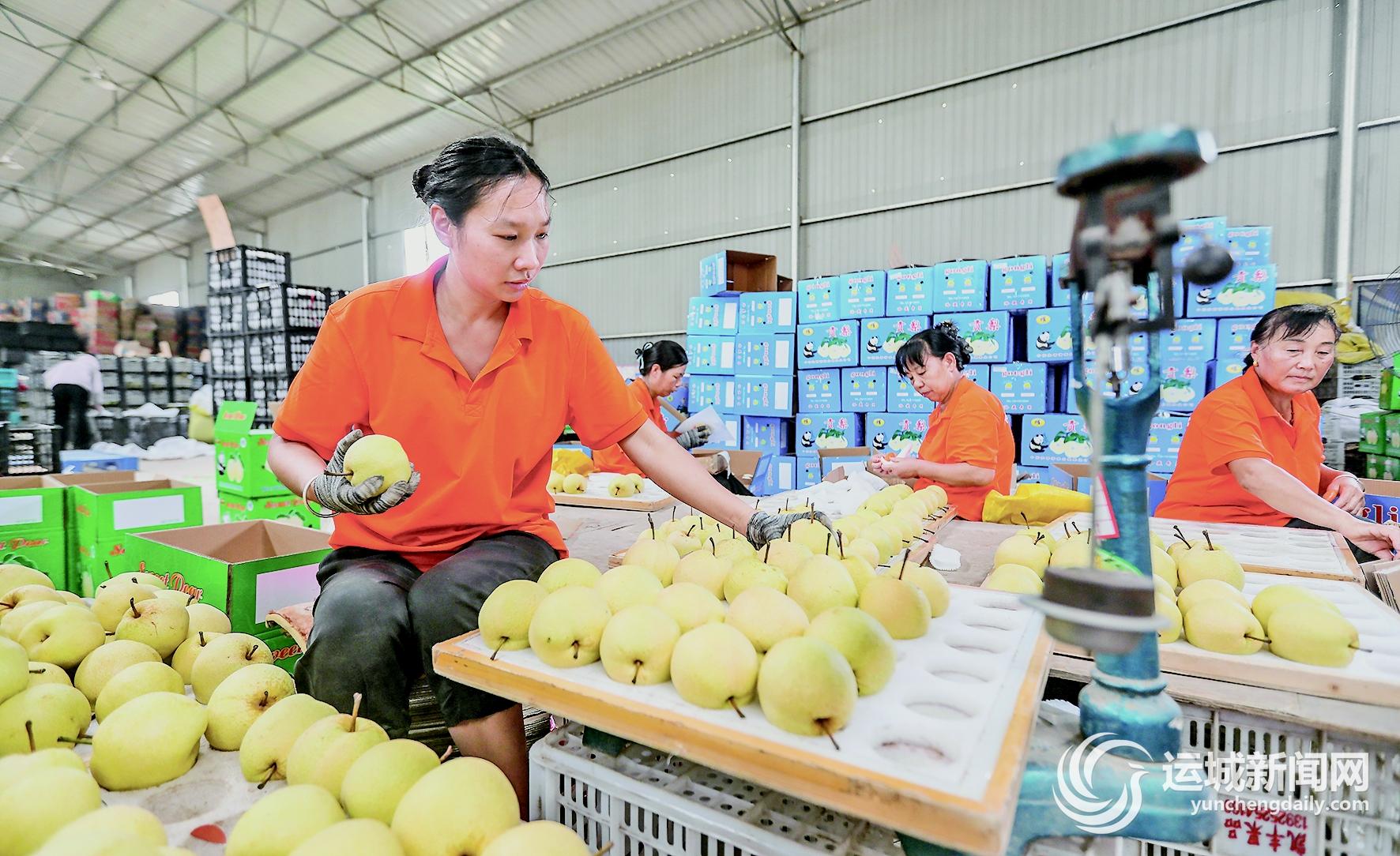 8月11日,临猗县姚海霞果品种植专业合作社工作人员在收购酥梨。近年来,该合作社带动周边果农积极调产,并统一收购、销售,助力当地800余户果农增产增收。
