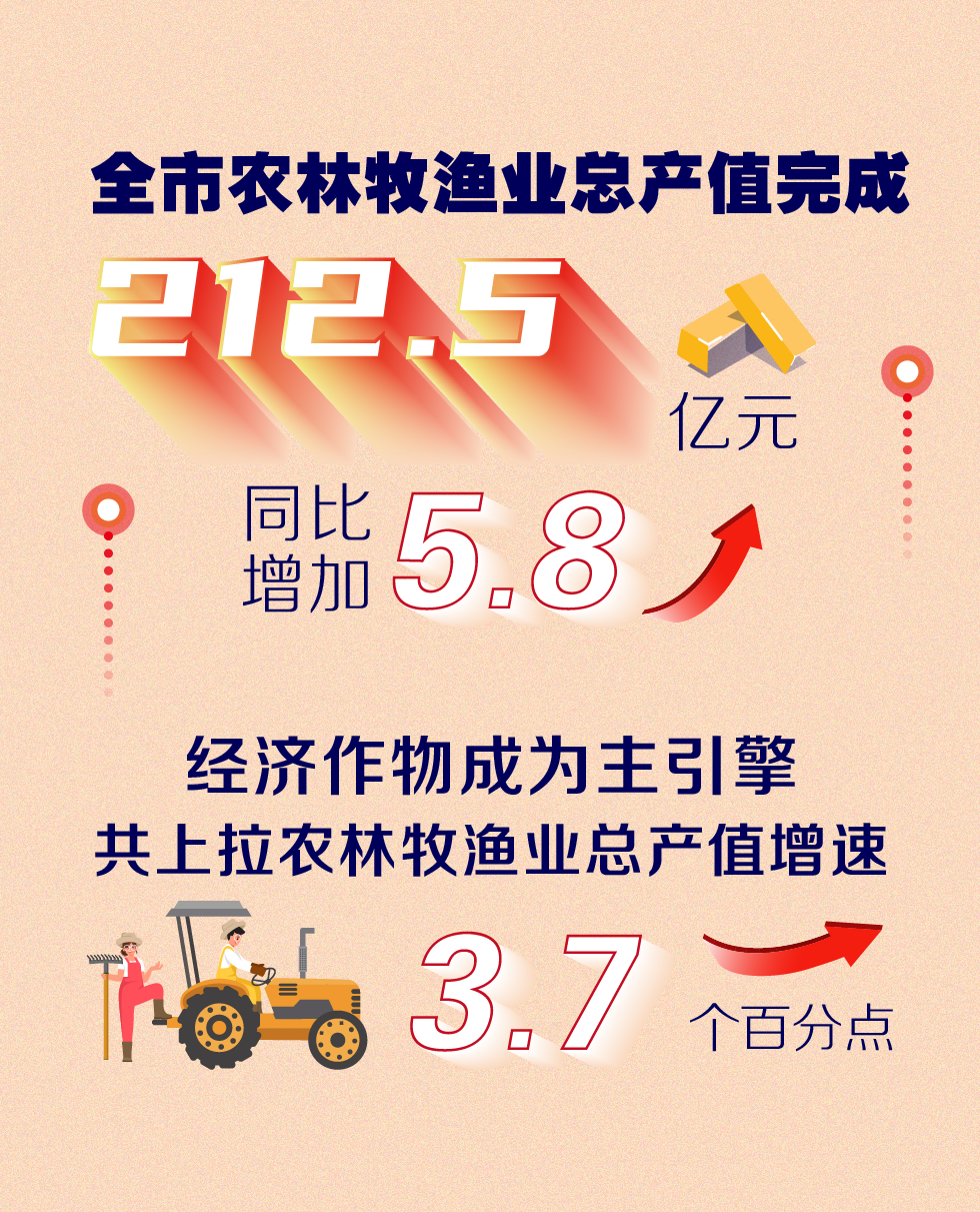 本报讯(记者 陈永年)今年上半年,全市农林牧渔业总产值完成212.5亿元,同比增长5.8%。其中,水果、蔬菜、中药材等经济作物成为主引擎,共上拉农林牧渔业总产值增速3.7个百分点。