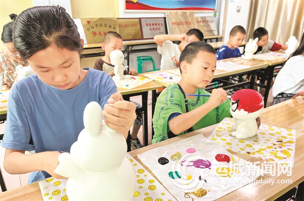 8月13日,在社区党群服务中心,返乡大学生志愿者李霜莹正在教孩子们给石膏娃娃涂色。
