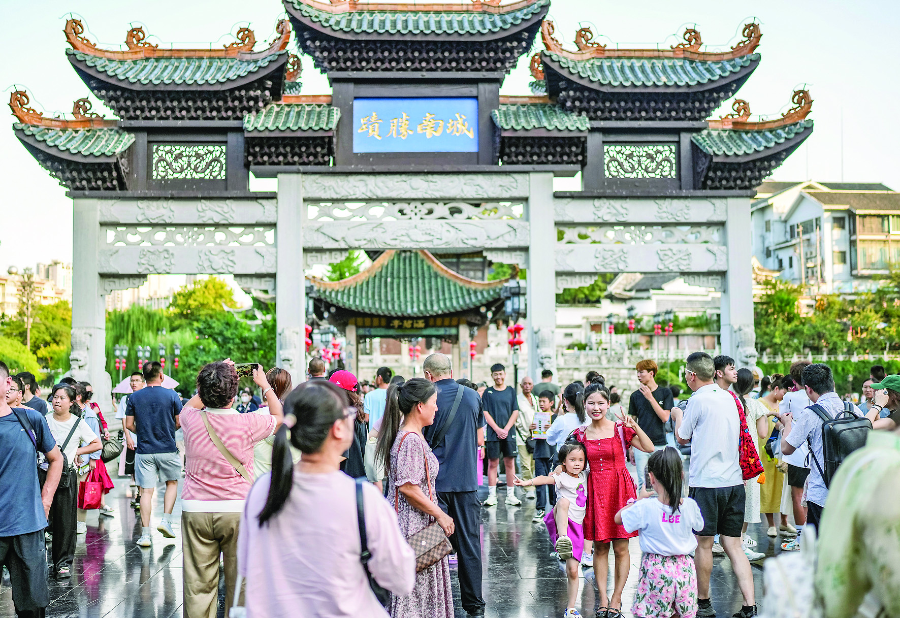 游客在贵阳市南明区甲秀楼景区拍照留念(8月13日摄)。