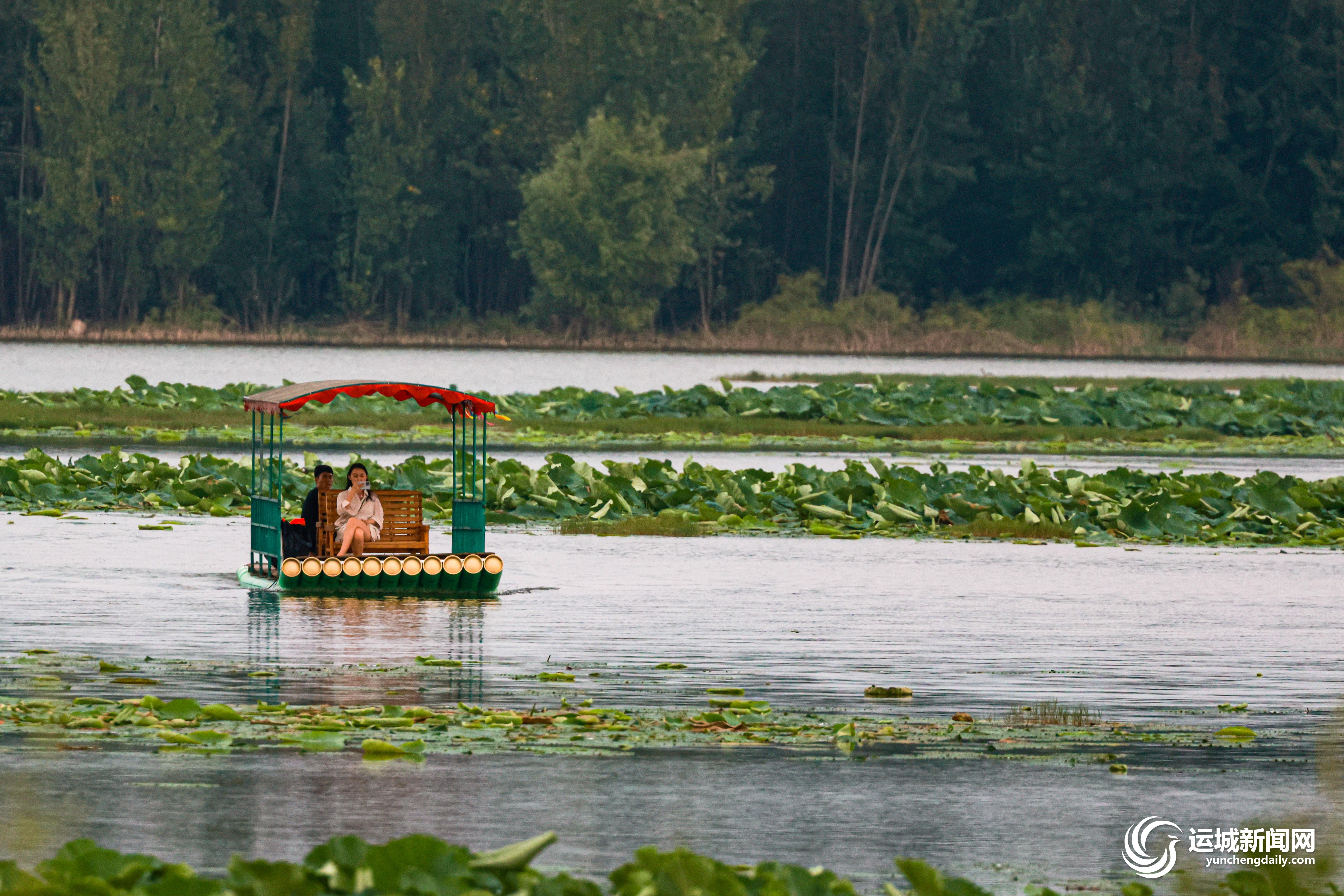立秋时节,平陆三湾大天鹅景区,碧绿的荷叶铺满水面,与周边山水呼应,勾勒出一幅初秋河景图,吸引众多游客前来游玩。图为游客泛舟湖上,近距离感受初秋风光。特约摄影 杨新智 摄