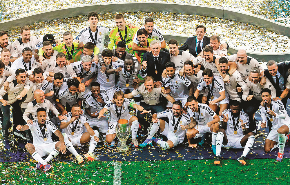8月14日,皇家马德里队在颁奖仪式上庆祝夺冠。