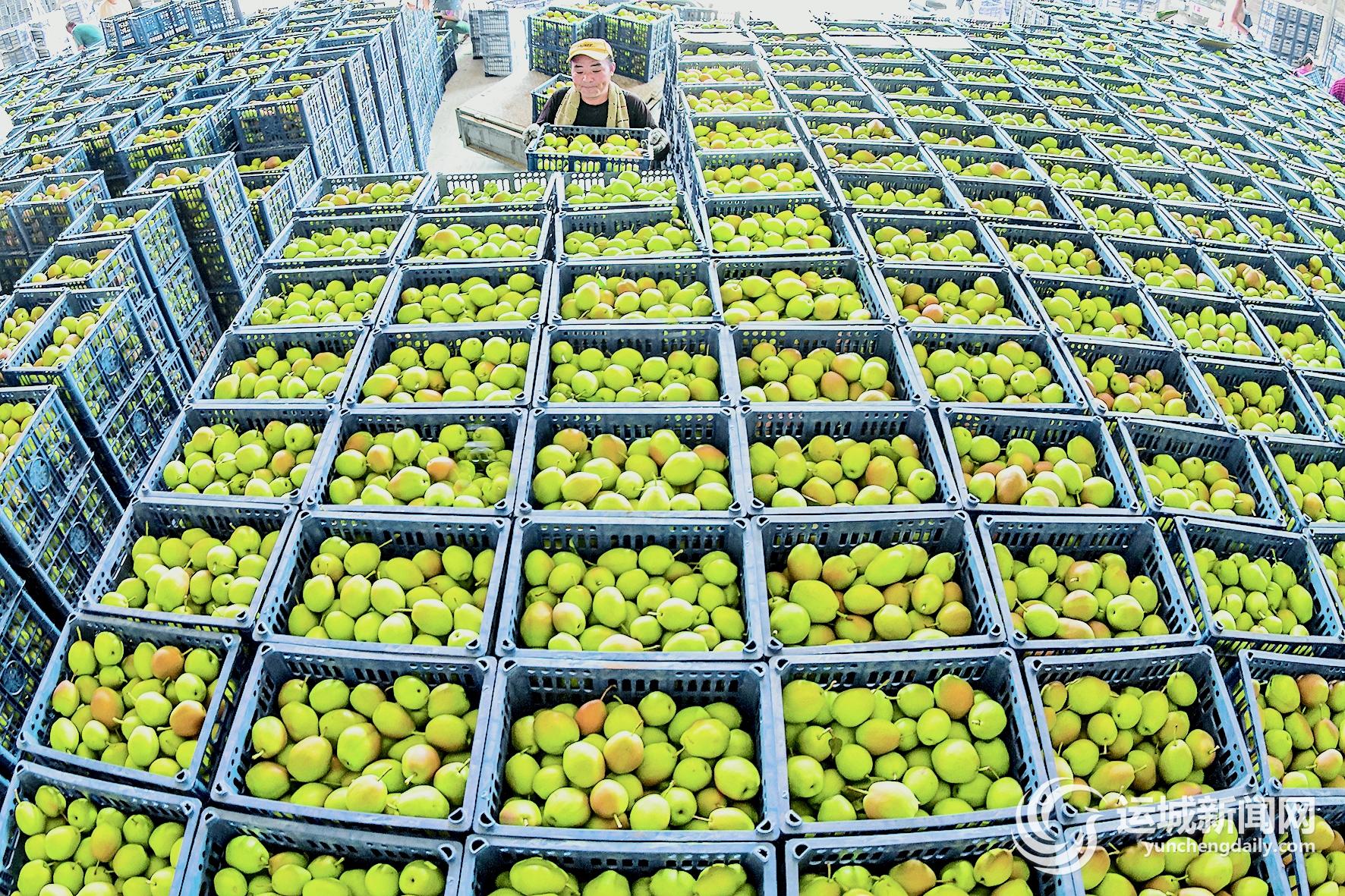 8月14日,梨农在盐湖区龙居镇一处梨园里采收红香酥梨。龙居镇种植的6万余亩红香酥梨迎来丰收季,这些红香酥梨大多销往我国东北地区以及韩国、马来西亚、新加坡等国家。特约摄影 姜 桦 摄