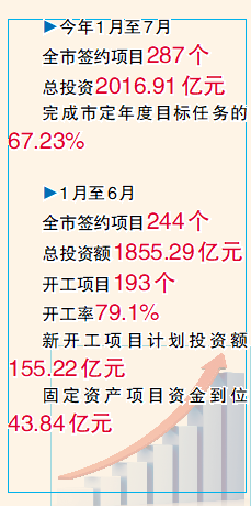 今年1月至7月,全市签约项目287个,总投资2016.91亿元,完成市定年度目标任务的67.23%。其中,1月至6月,签约项目244个,总投资额1855.29亿元;开工项目193个,开工率79.1%;新开工项目计划投资额155.22亿元;固定资产项目资金到位43.84亿元。综合指标排名全省第一。