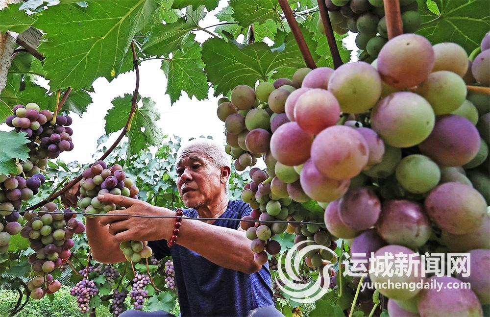8月16日,果农在新绛县龙兴镇一处葡萄园采摘葡萄。眼下,运城各地的巨峰、户太等20多种葡萄进入销售旺季,果农抢抓晴好天气采摘,线上线下加紧销售。