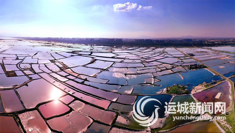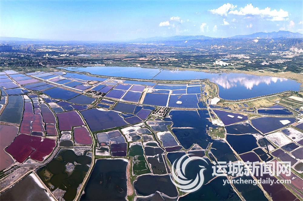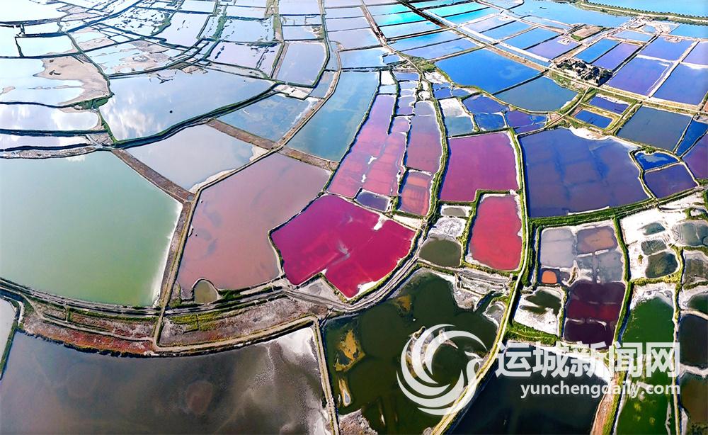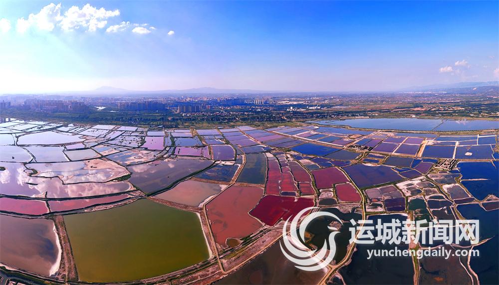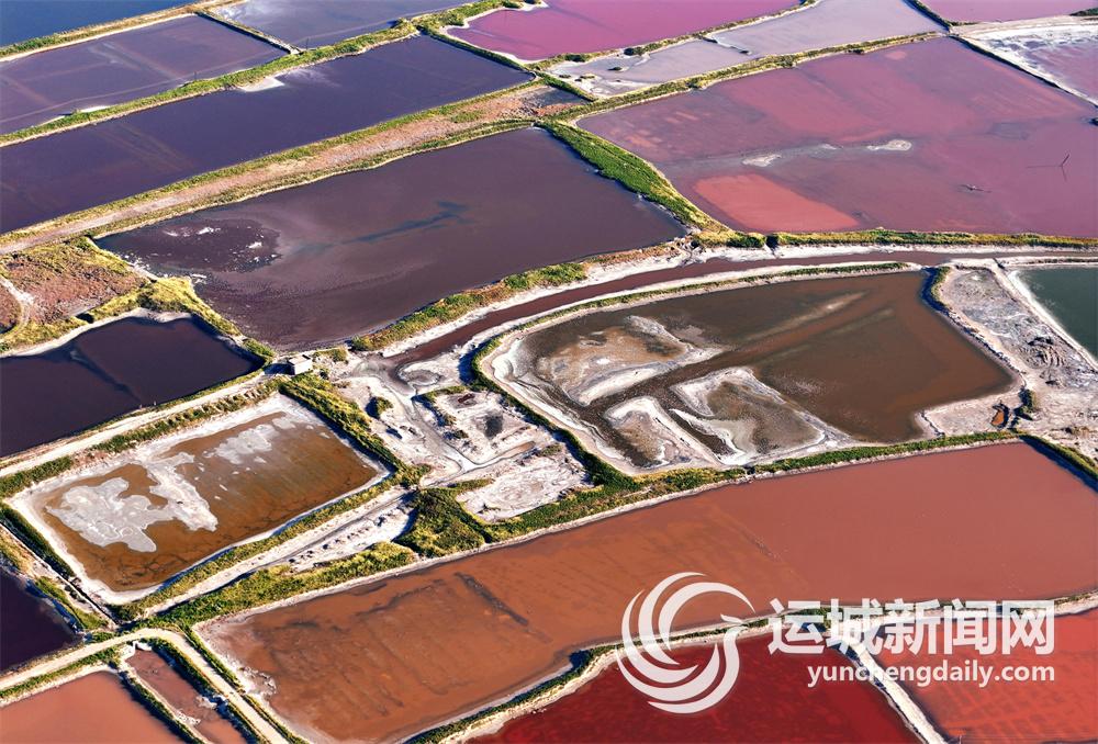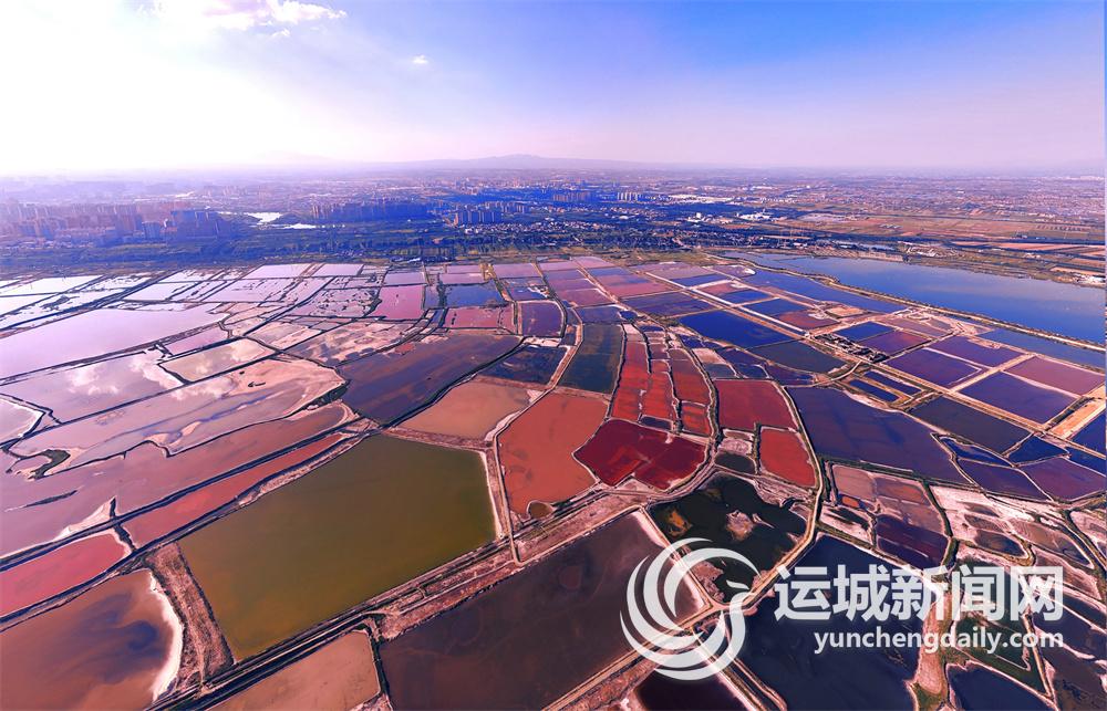 初秋时节,运城盐湖呈现色彩斑斓、美不胜收的七彩景色,从空中俯瞰,宛若一个巨型的调色板。